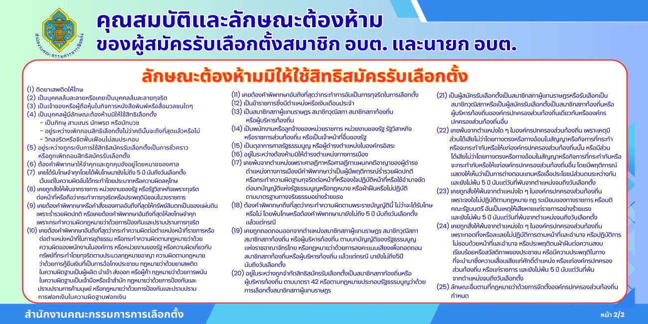 ภาพที่เกี่ยวข้อง ประชาสัมพันธ์ คุณสมบัติและลักษณะต้องห้ามของผู้สมัครรับเลือกตั้งสมาชิกสภาองค์การบริหารส่วนตำบลและนายกองค์การบริหารส่วนตำบล