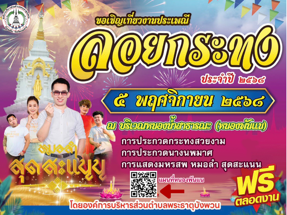 องค์การบริหารส่วนตำบลพระธาตุบังพวน ขอเชิญชวนพี่น้องประชาชนร่วมสืบสานประเพณีอันงดงามของไทย งานประเพณีลอยกระทง ประจำปี 2568
