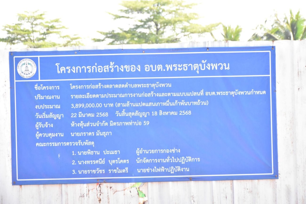 ตามที่สำนักงาน ป.ป.ช. ประจำจังหวัดหนองคาย ได้รับแจ้งจากศูนย์ป้องปรามการทุจริตแห่งชาติ (Corruption Deterrence Center : CDC) กรณีโครงการก่อสร้างตลาดสดตำบลพระธาตุบังพวน ซึ่งอยู่ในความรับผิดชอบขององค์การบริหารส่วนตำบลพระธาตุบังพวน อำเภอเมืองหนองคาย จังหวัดหนองคาย งบประมาณก่อสร้าง 3,899,000.00 บาท วันเริ่มสัญญา 22 มีนาคม 2568 วันสิ้นสุดสัญญา 18 สิงหาคม 2568 ผู้รับจ้าง คือ ห้างหุ้นส่วนจำกัด มิตรภาพท่าบ่อ 59 ในเบื้องต้นทราบว่าปัจจุบันโครงการก่อสร้างดังกล่าวยังไม่แล้วเสร็จ ซึ่งอาจะเกิดความเสียหายต่อราชการได้